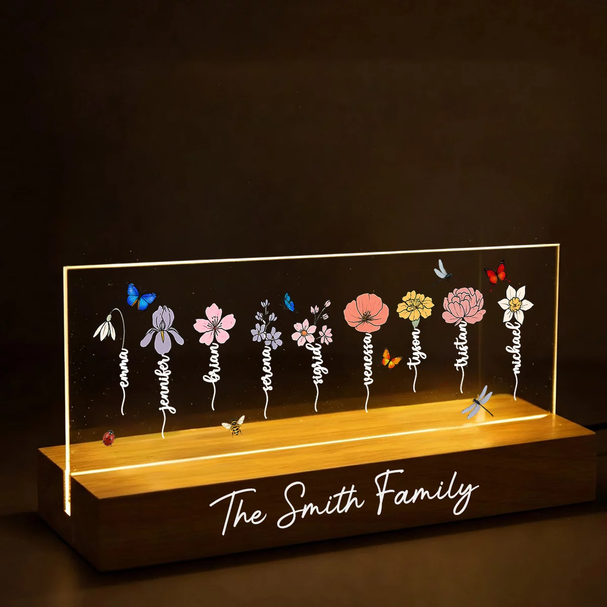 Custom Acrylic Block LED Night Light – Family Members Birth Month Flowers – Personalized Gift For Dad, Mom, Son, Daughter