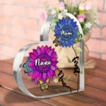 Celebrate the cherished roles of family with this set of two personalized heart-shaped acrylic plaques, a beautiful keepsake to honor Nana, Mama, and Grandma! Featuring custom names and a vibrant sunflower design with butterflies, they’re a lovely way to display your love at home or gift to family members for a special occasion.